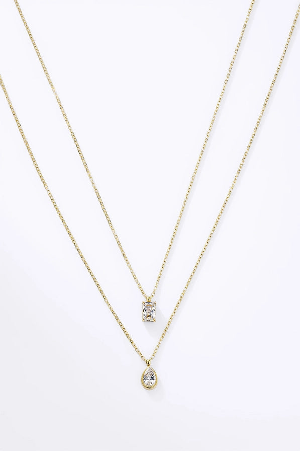 La seconda catena ospita un ciondolo a goccia con zircone taglio brillante, incastonato in una montatura liscia che ne esalta la forma delicata.